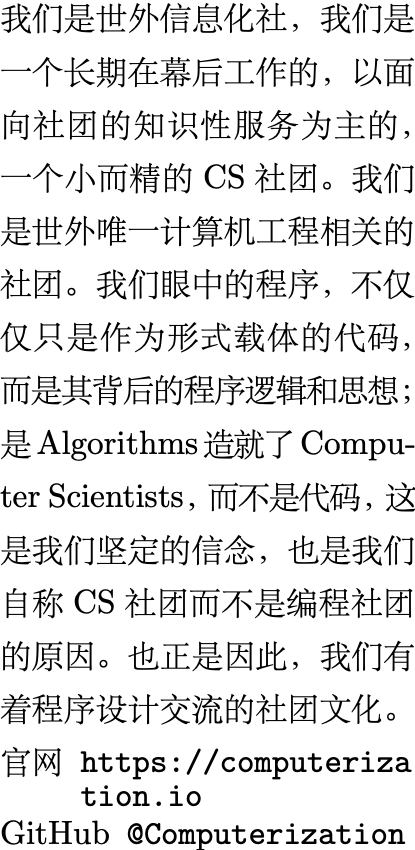 我们是一个长期在幕后工作的,以面向社团的知识性服务为主的,一个小而精的 CS 社团。我们的全称是 Computerization,世外信息化社;不过我们更喜欢被称之为 C 社。